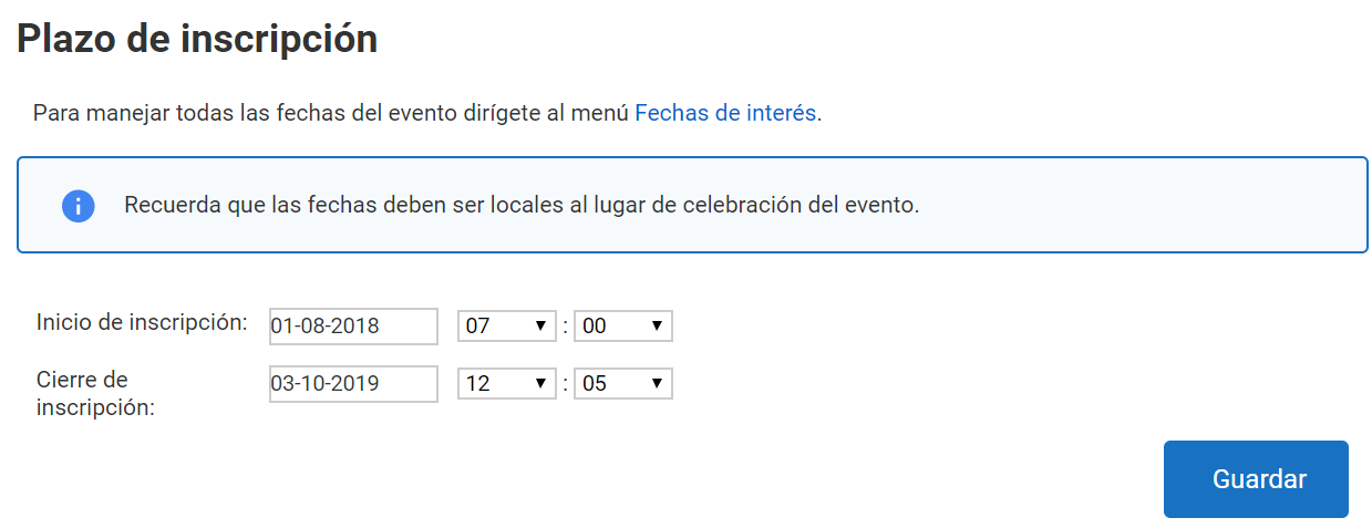Es obligatorio rellenar los campos de Inicio y Fin de inscripción. Pasado este periodo de tiempo, la inscripción al evento dejará de estar disponible. El resto de los campos son opcionales. Sin embargo, es importante que se tenga en cuenta las fechas de celebración del evento para que no se produzcan fallos. Una vez finalizado el proceso, asegúrate de guardar los cambios.