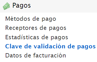 Puedes añadir una clave de seguridad si lo deseas en el Panel de Administración > Pagos > Clave de validación de pagos: