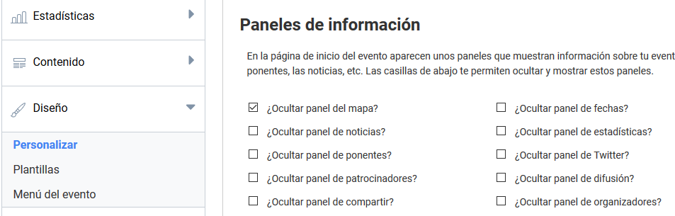 - Por último, es posible ocultar la sección donde aparece la ubicación en la web del evento mediante la inserción del siguiente bloque de código que tendrás que incluir en el menú Diseño > Personalización.