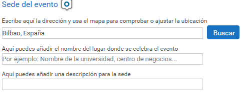 - También es posible aclarar información en los campos adicionales de ubicación. Como por ejemplo, que se trata de un evento online. En Herramientas > Mapa puedes añadir información adicional en el último campo:
