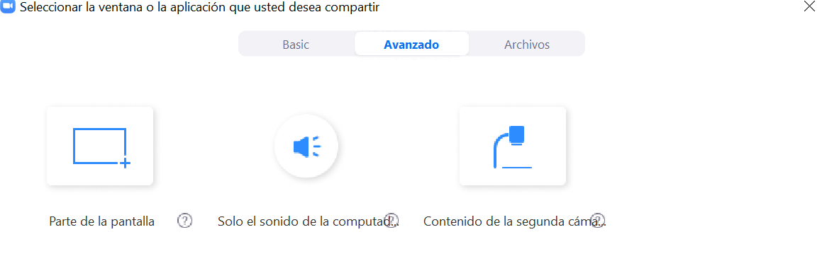 Para compartir la pantalla, localiza el control. Puedes escoger la vista del navegador o escritorio que quieres mostrar a tu audiencia desde el modal que se abre a continuación. Desde la pestaña Basic, selecciona la pantalla que deseas compartir. Desde aquí puedes activar la funcionalidad de pizarra virtual para ilustrar tus ideas.