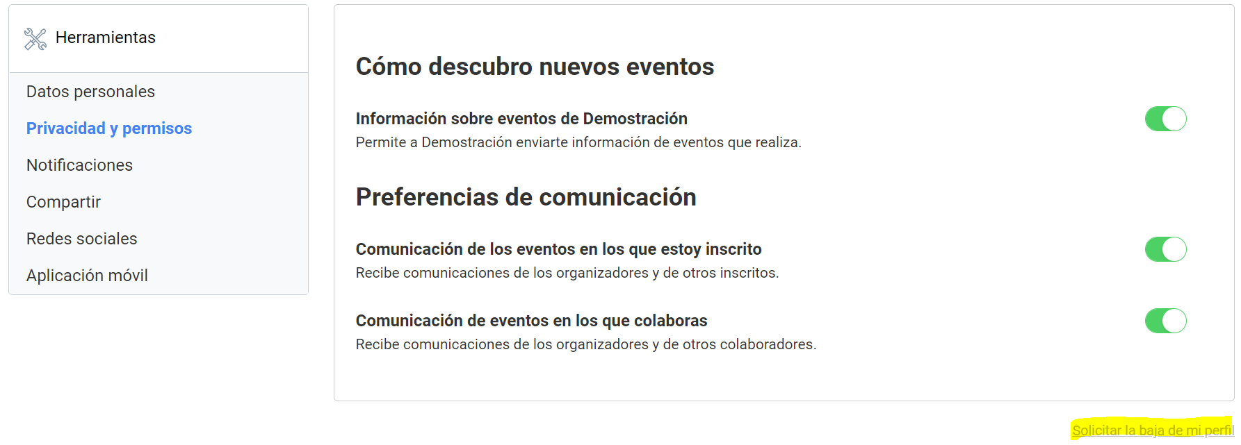 - En el menú de la izquierda, localiza "Privacidad y permisos". Aquí puedes gestionar los permisos referentes a las notificaciones de la plataforma. Debajo de este panel, encontrarás la opción "Solicitar baja de mi perfil"